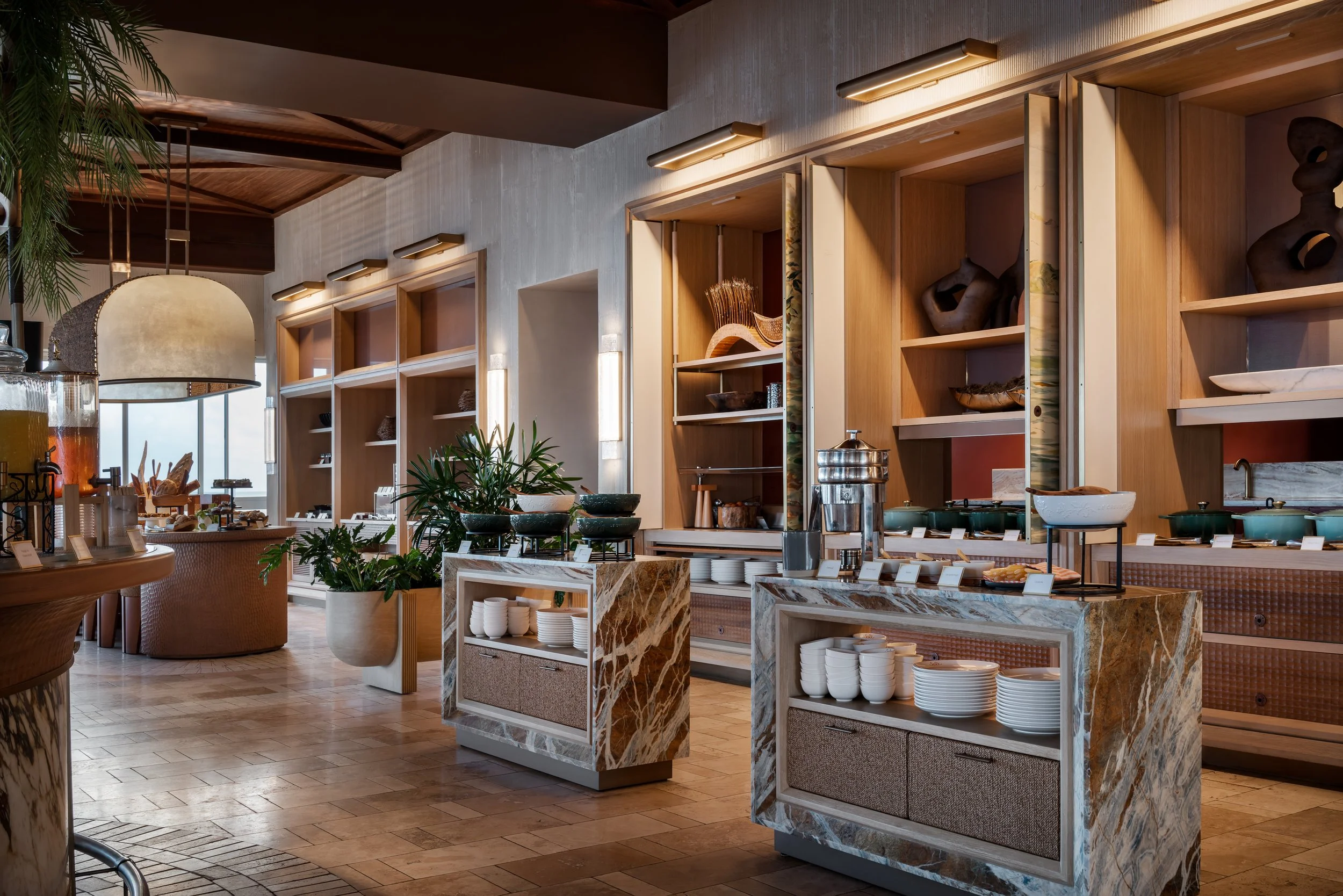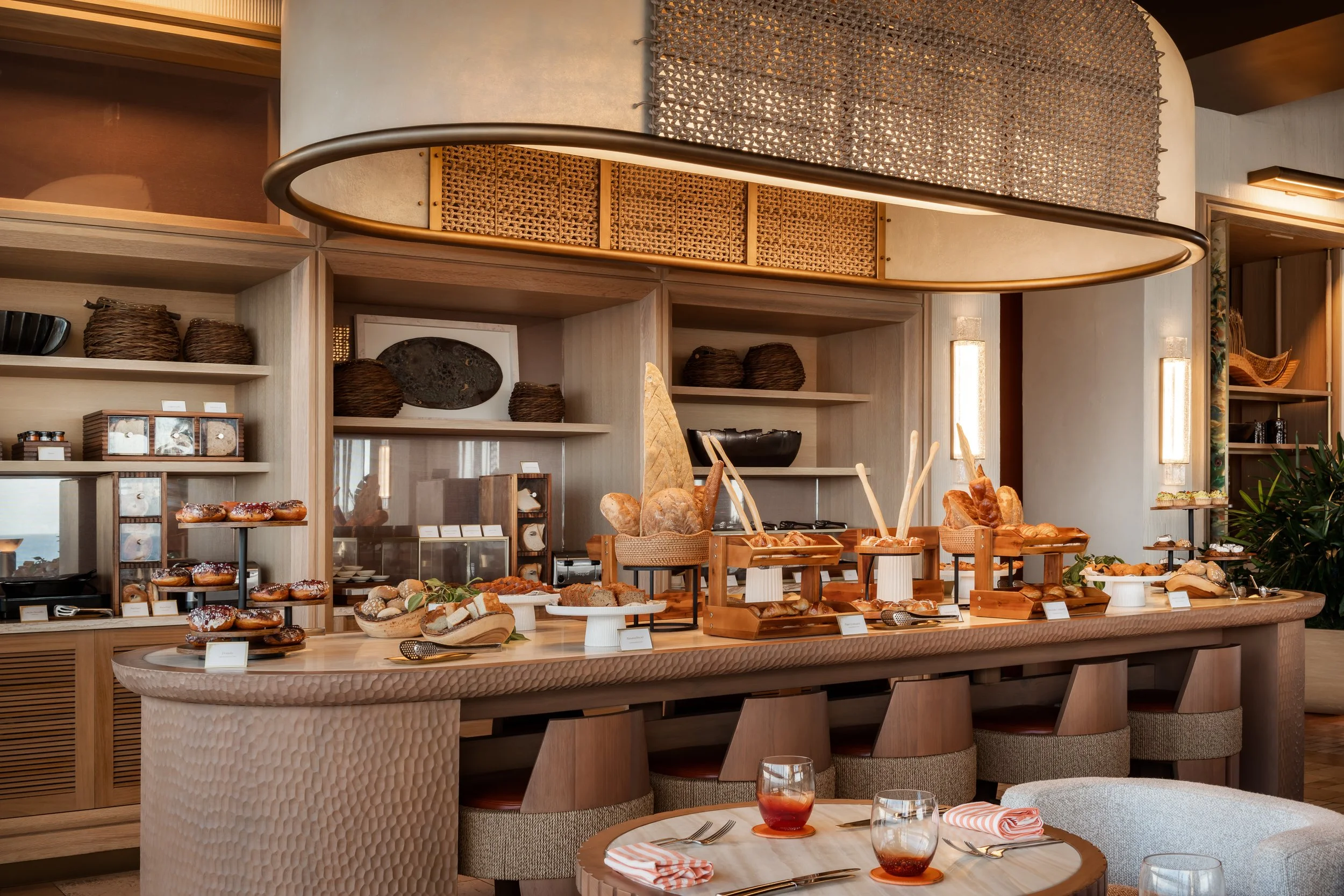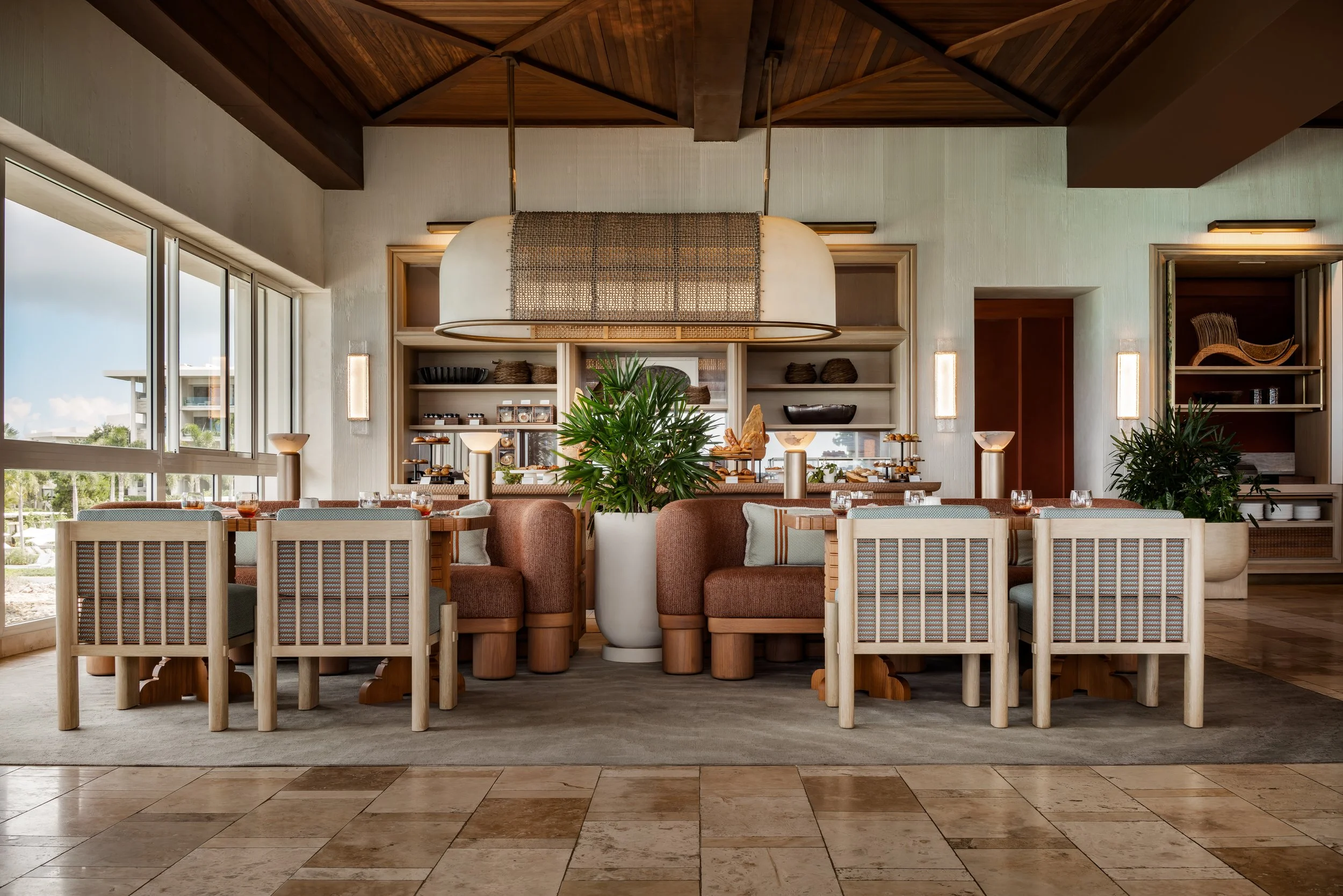 At the heart of the design is a dynamic millwork installation that allows the restaurant to transform seamlessly throughout the day. By morning, it opens to reveal an expansive buffet kitchen; by evening, it closes to unveil a striking mural depicting Anguilla’s salt harvesting heritage. Cast glass lighting elements further echo this story, shimmering softly as daylight fades. Through materiality, artistry, and thoughtful spatial choreography, Salt evolves effortlessly from a vibrant breakfast setting to an elegant fine dining experience — a celebration of island culture framed by sea and stone.