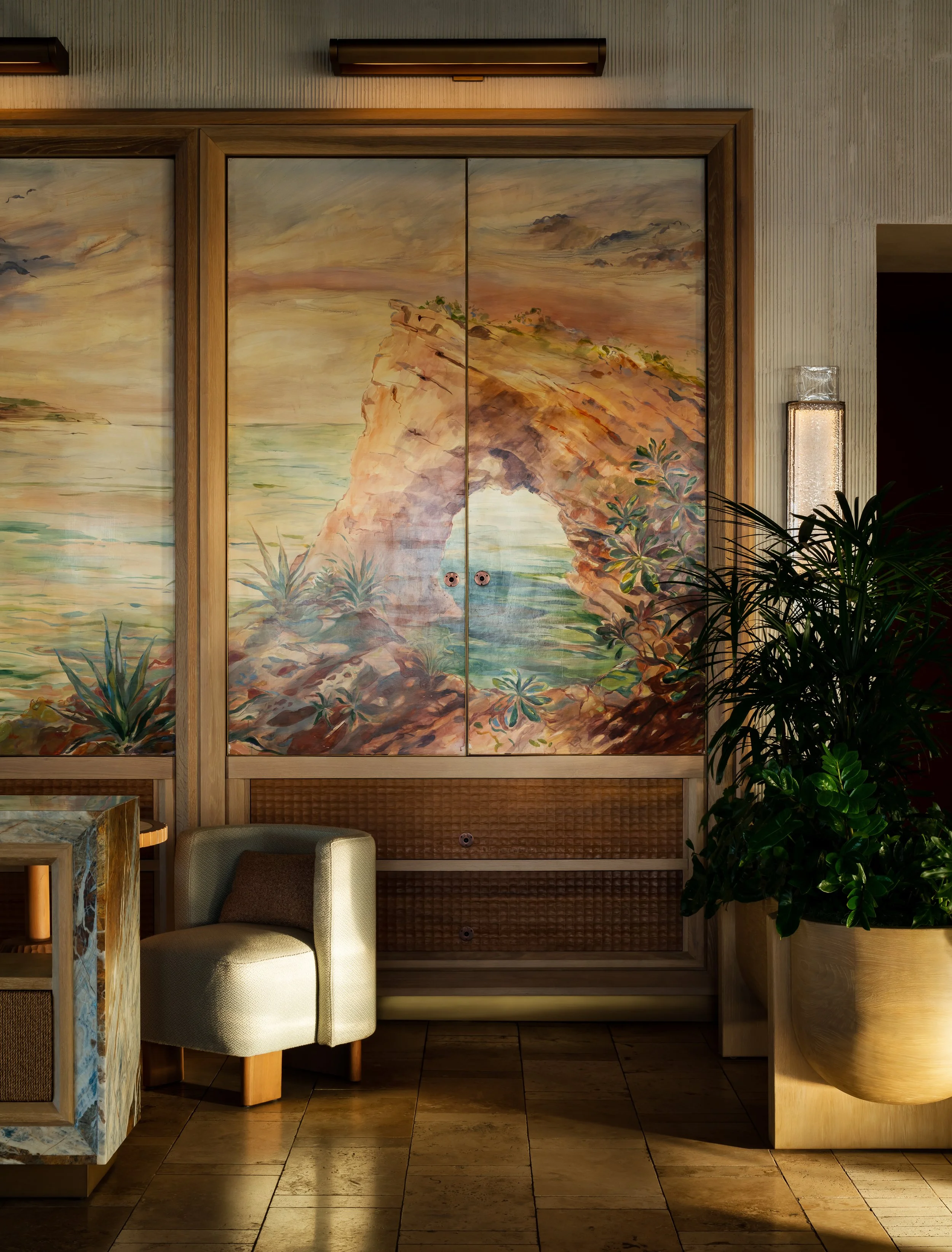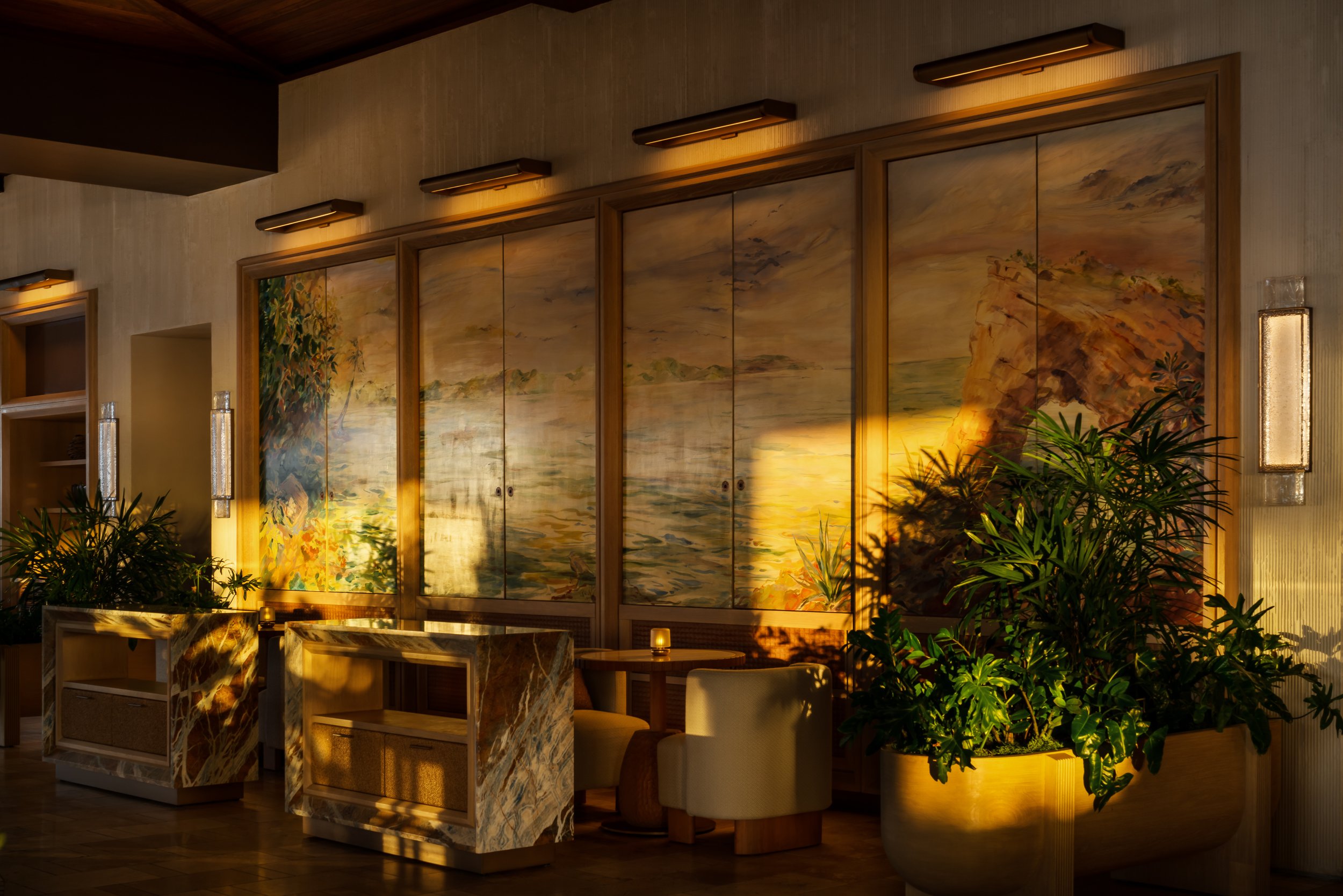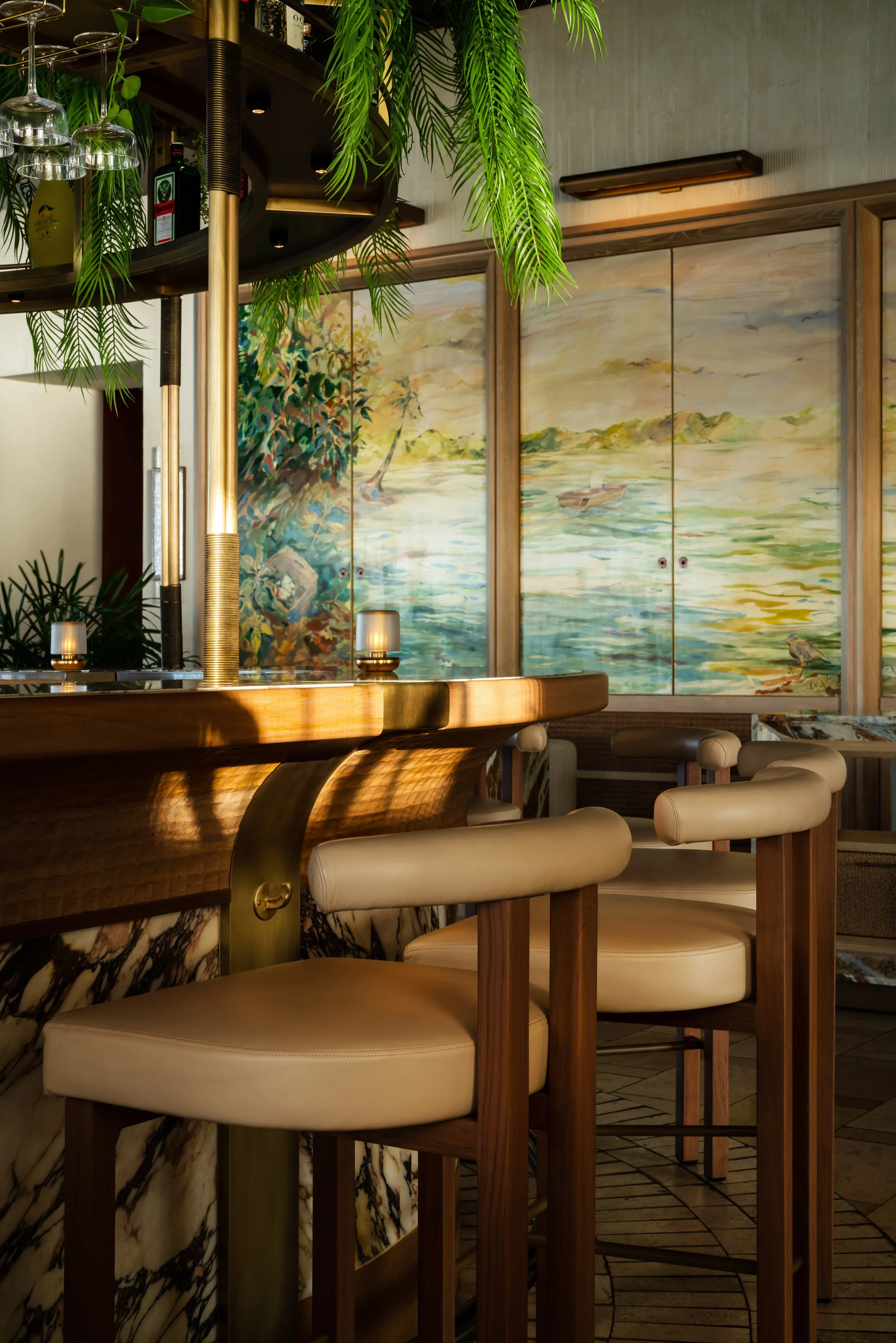 At the heart of the design is a dynamic millwork installation that allows the restaurant to transform seamlessly throughout the day. By morning, it opens to reveal an expansive buffet kitchen; by evening, it closes to unveil a striking mural depicting Anguilla’s salt harvesting heritage. Cast glass lighting elements further echo this story, shimmering softly as daylight fades. Through materiality, artistry, and thoughtful spatial choreography, Salt evolves effortlessly from a vibrant breakfast setting to an elegant fine dining experience — a celebration of island culture framed by sea and stone.