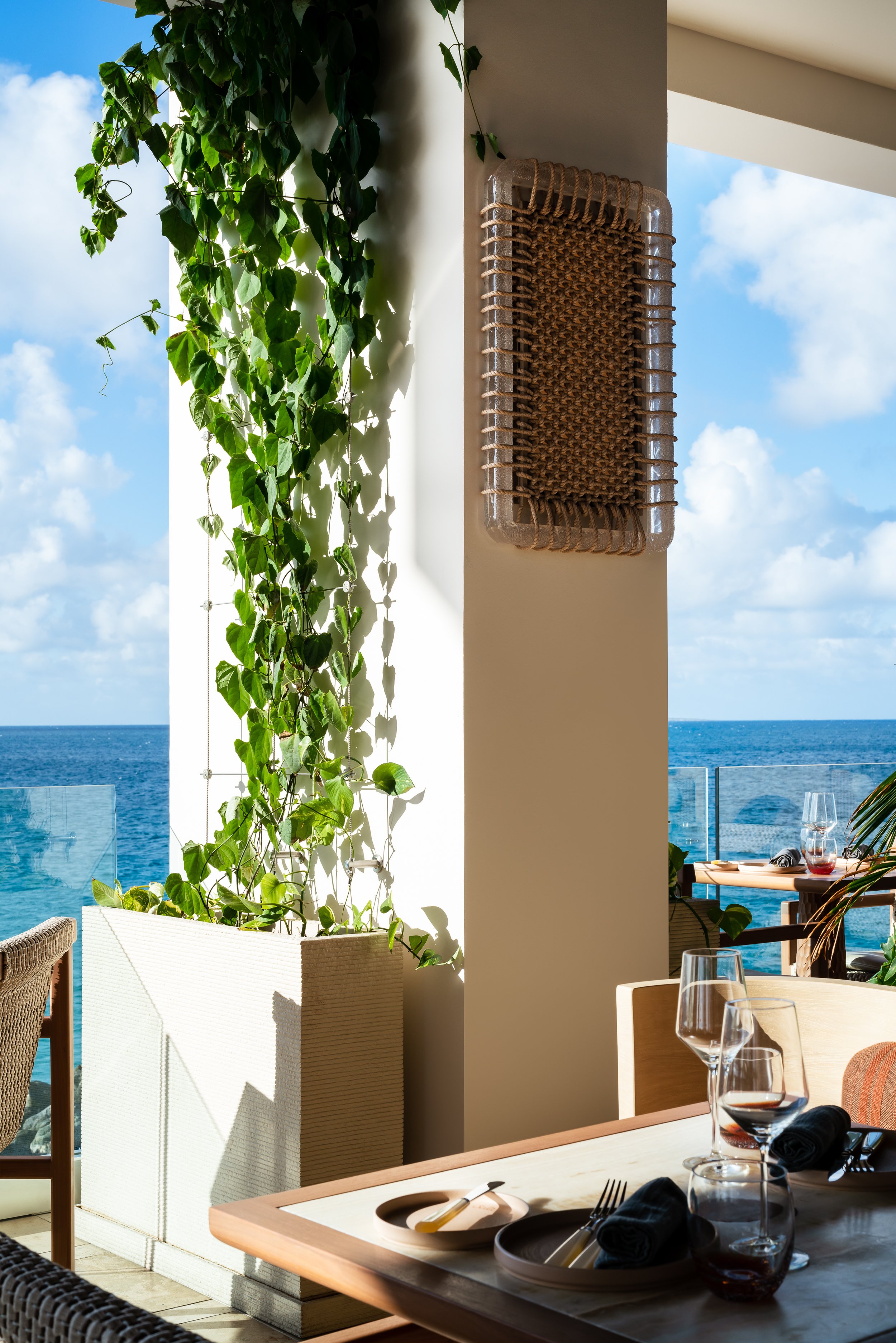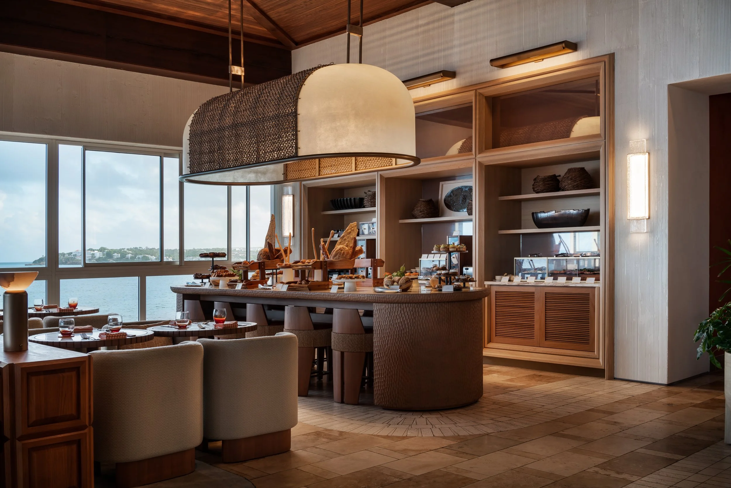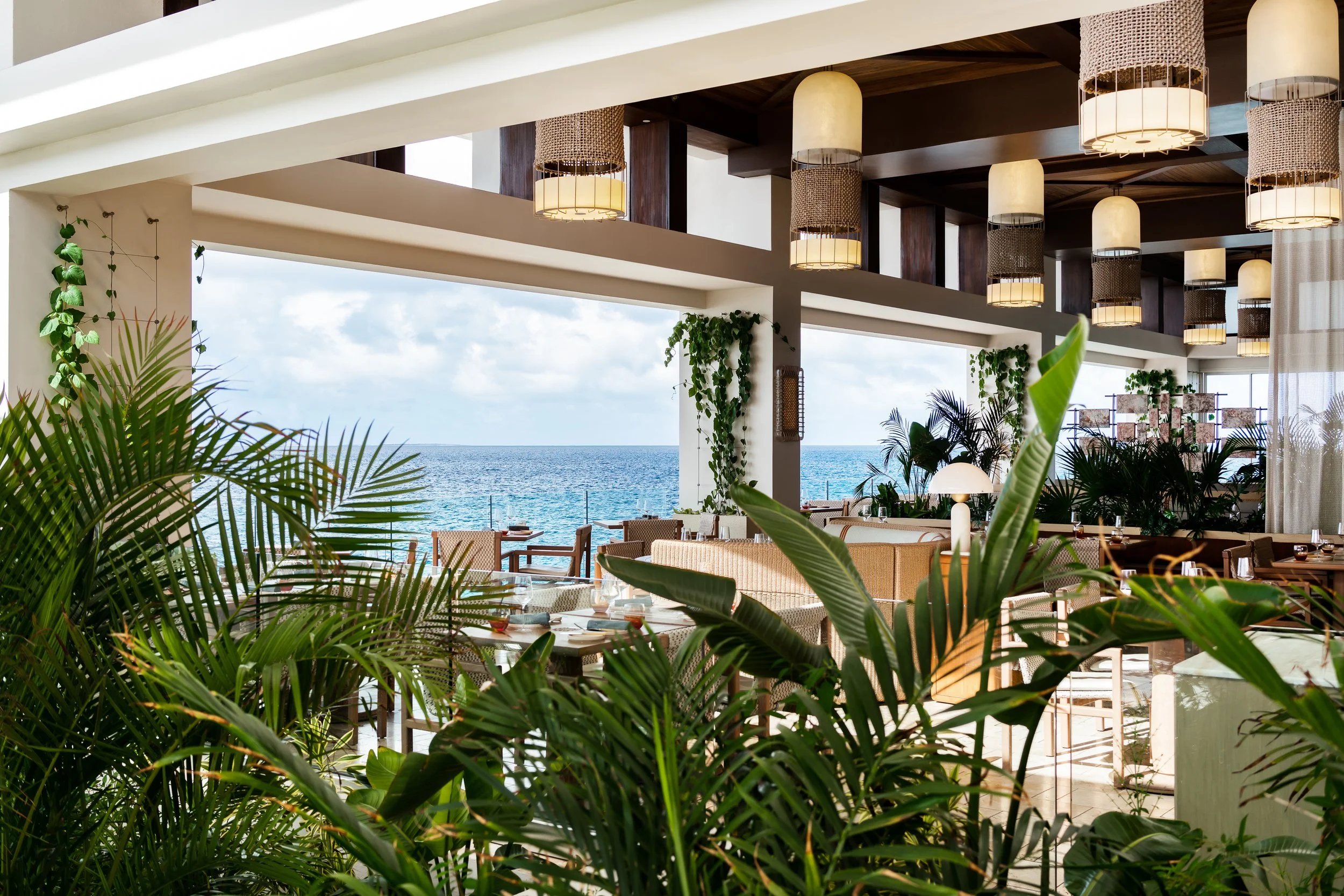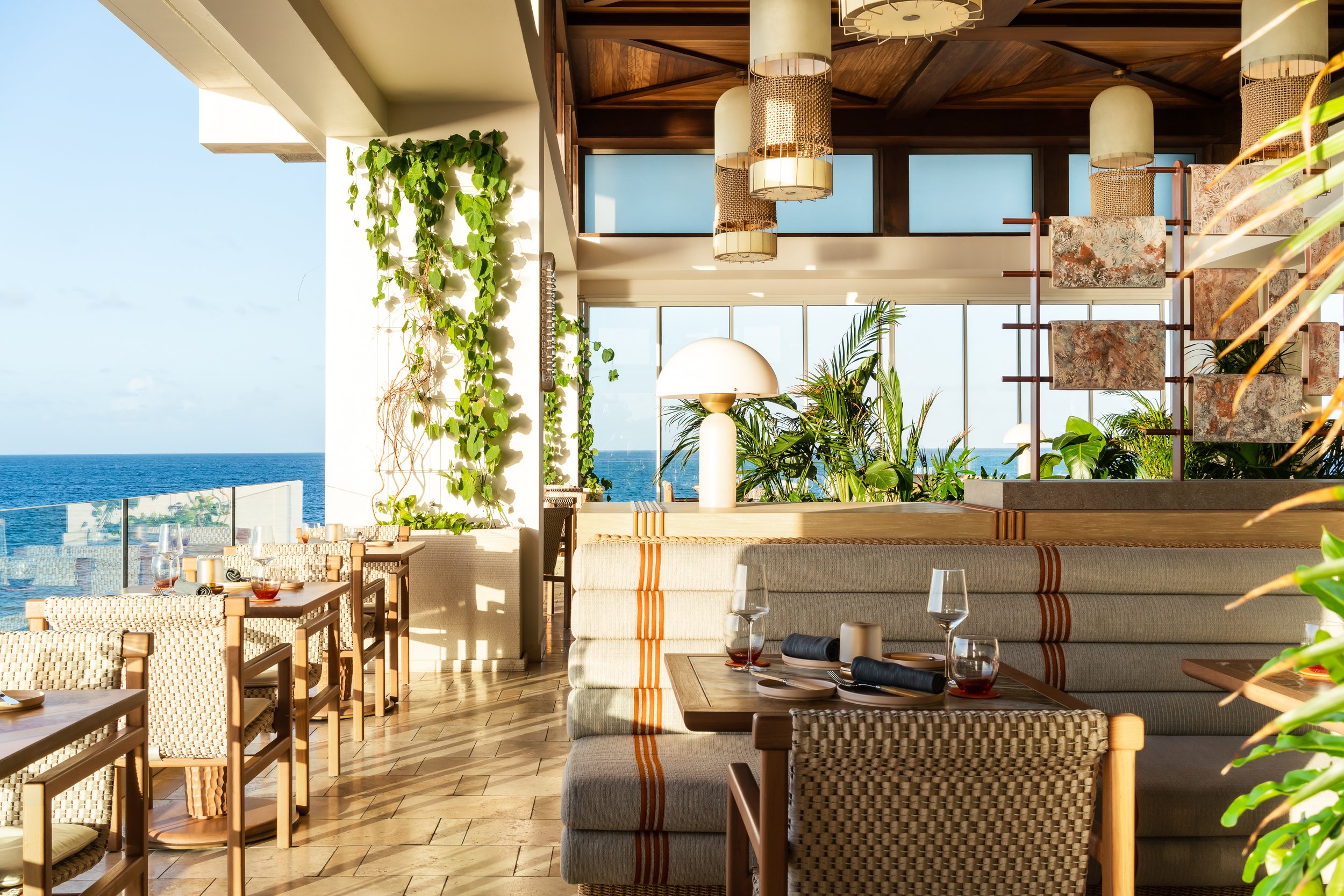 Layered plantings, flowing drapery, and curated artwork create intimate zones within the open-air plan, softening the architecture and framing views of sea and sky. A material palette inspired by the island’s rust and cream-toned limestone contrasts vividly with the surrounding turquoise water, grounding the space in its landscape. Custom furnishings and sculptural light fixtures draw from Anguilla’s weaving traditions and carved wood craftsmanship, infusing the restaurant with authenticity and tactile richness.