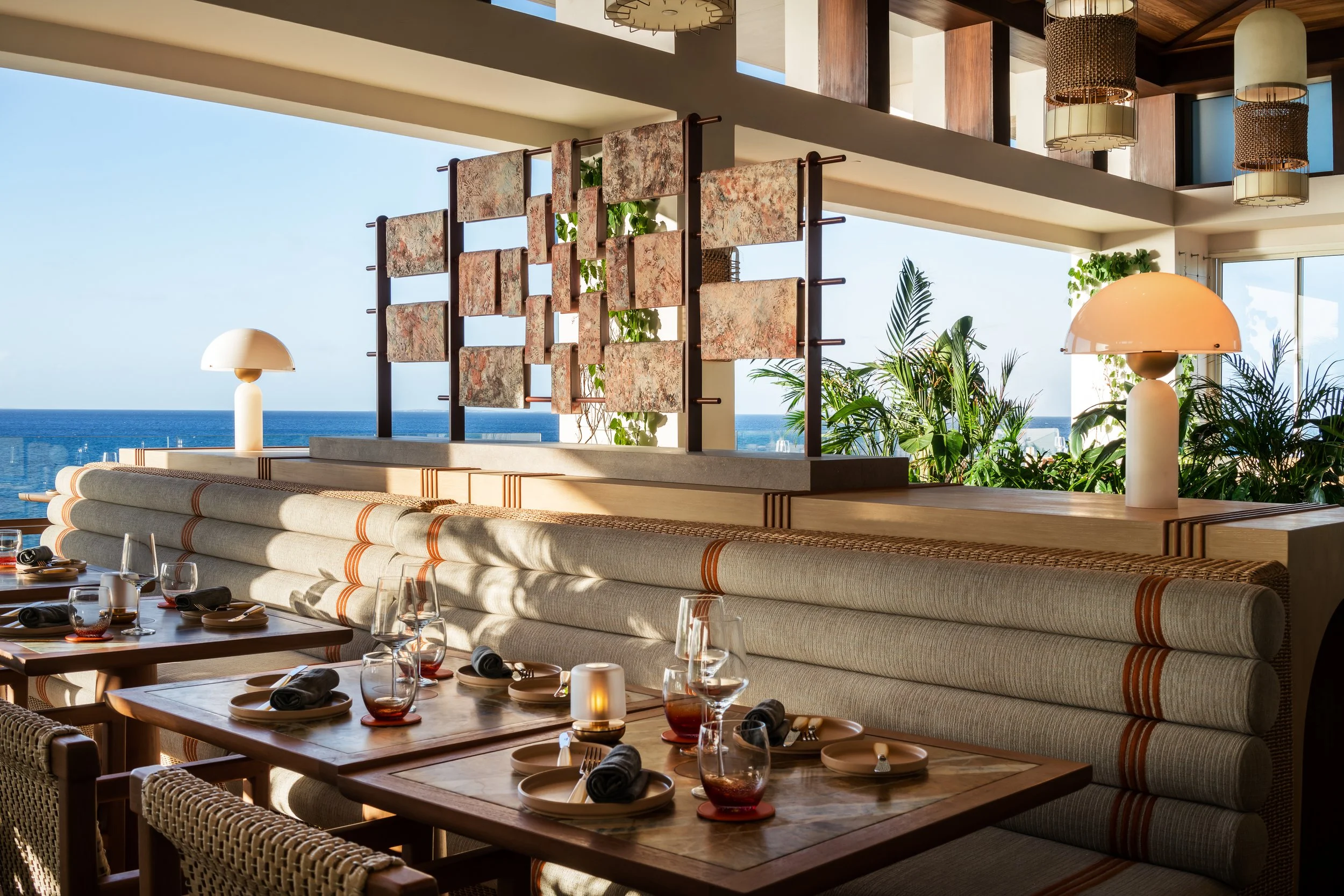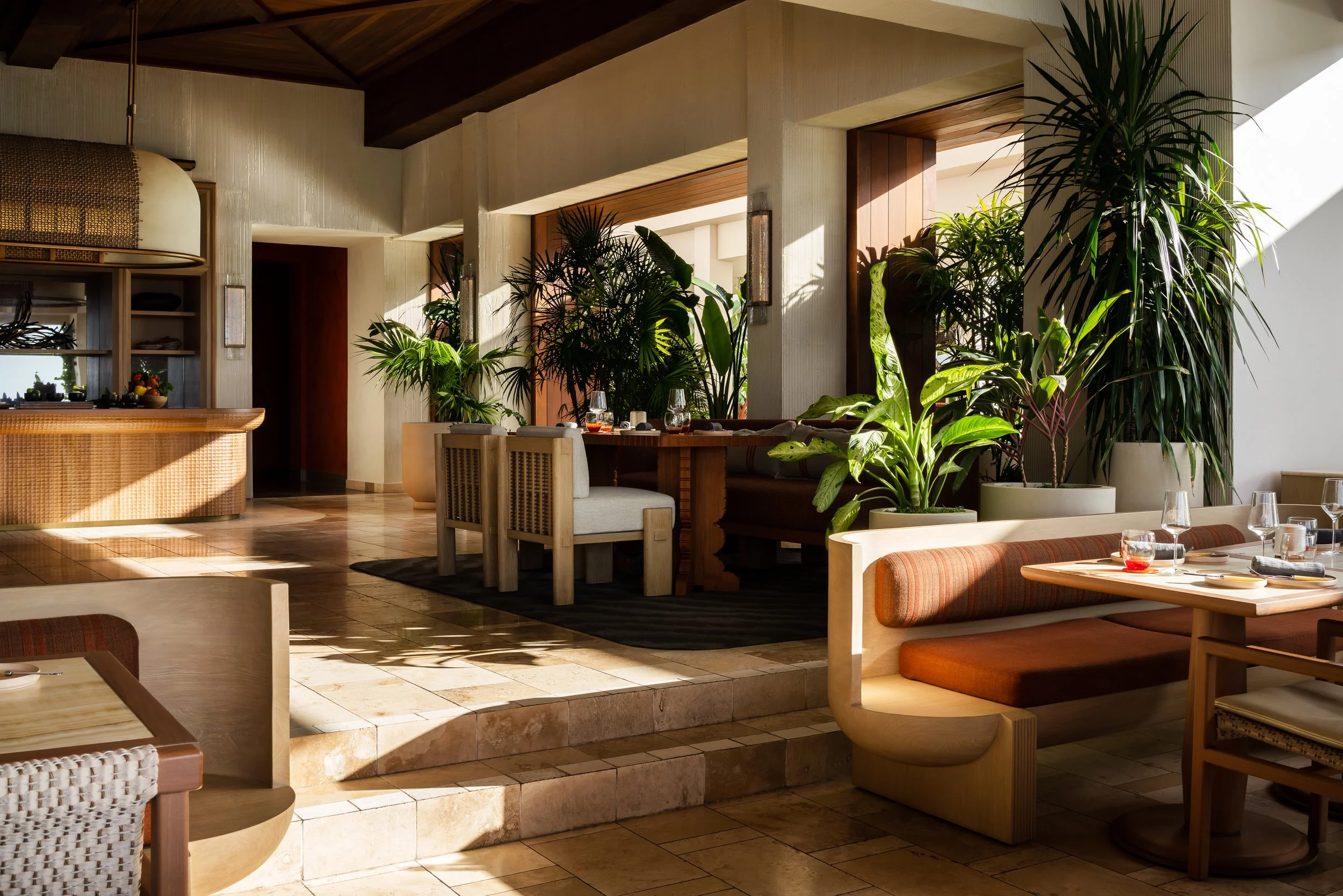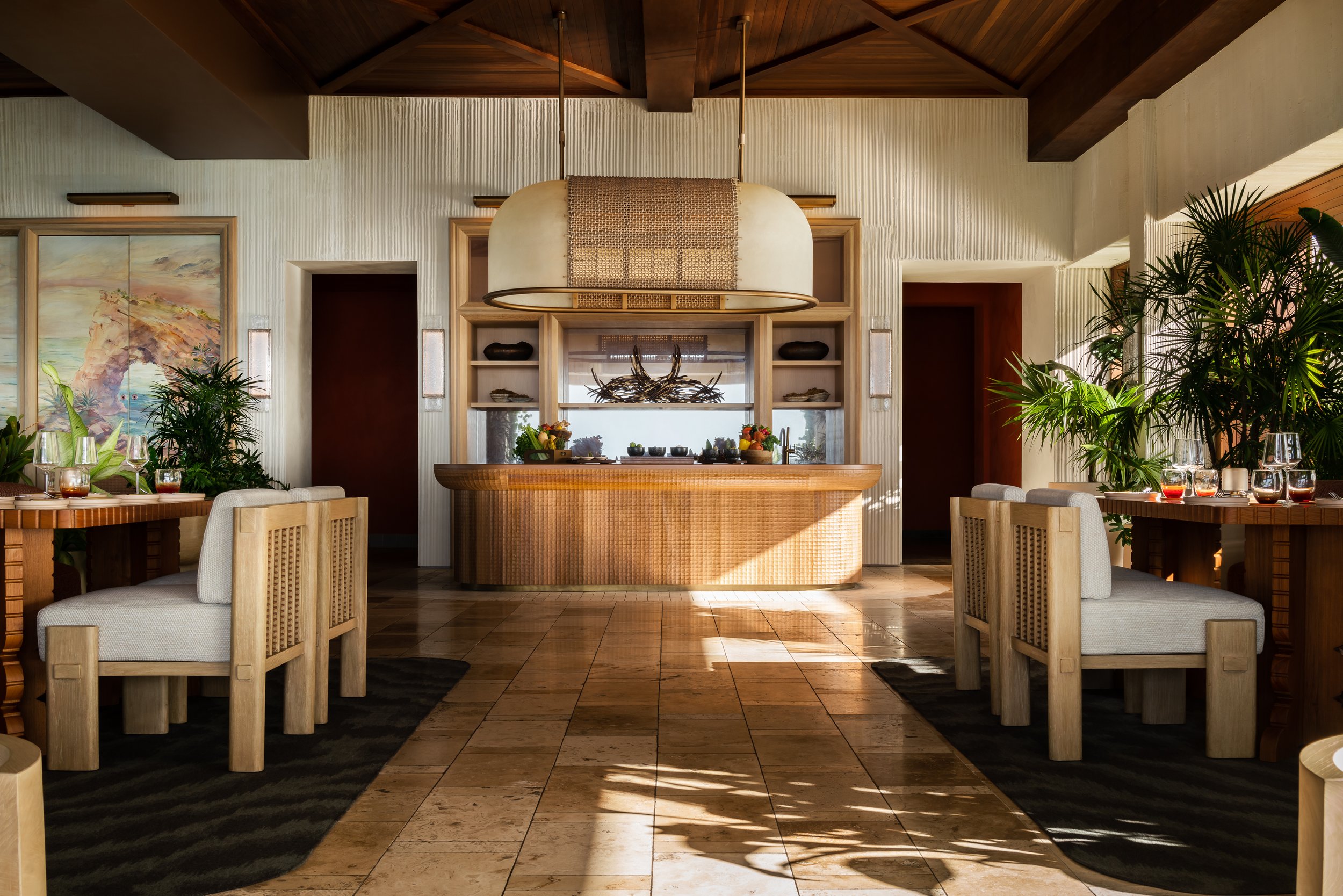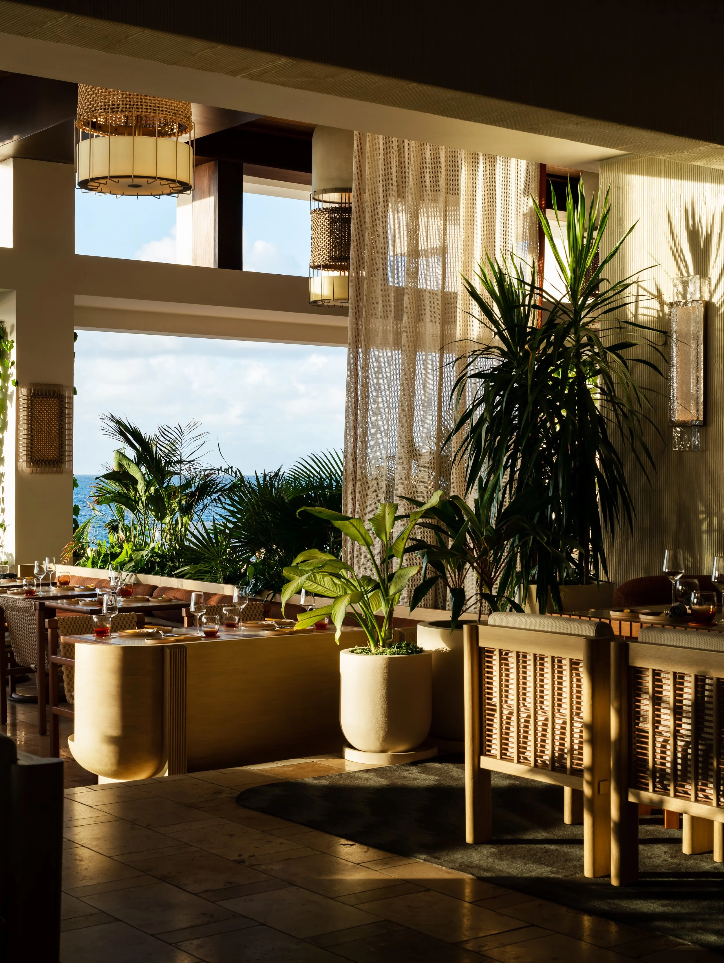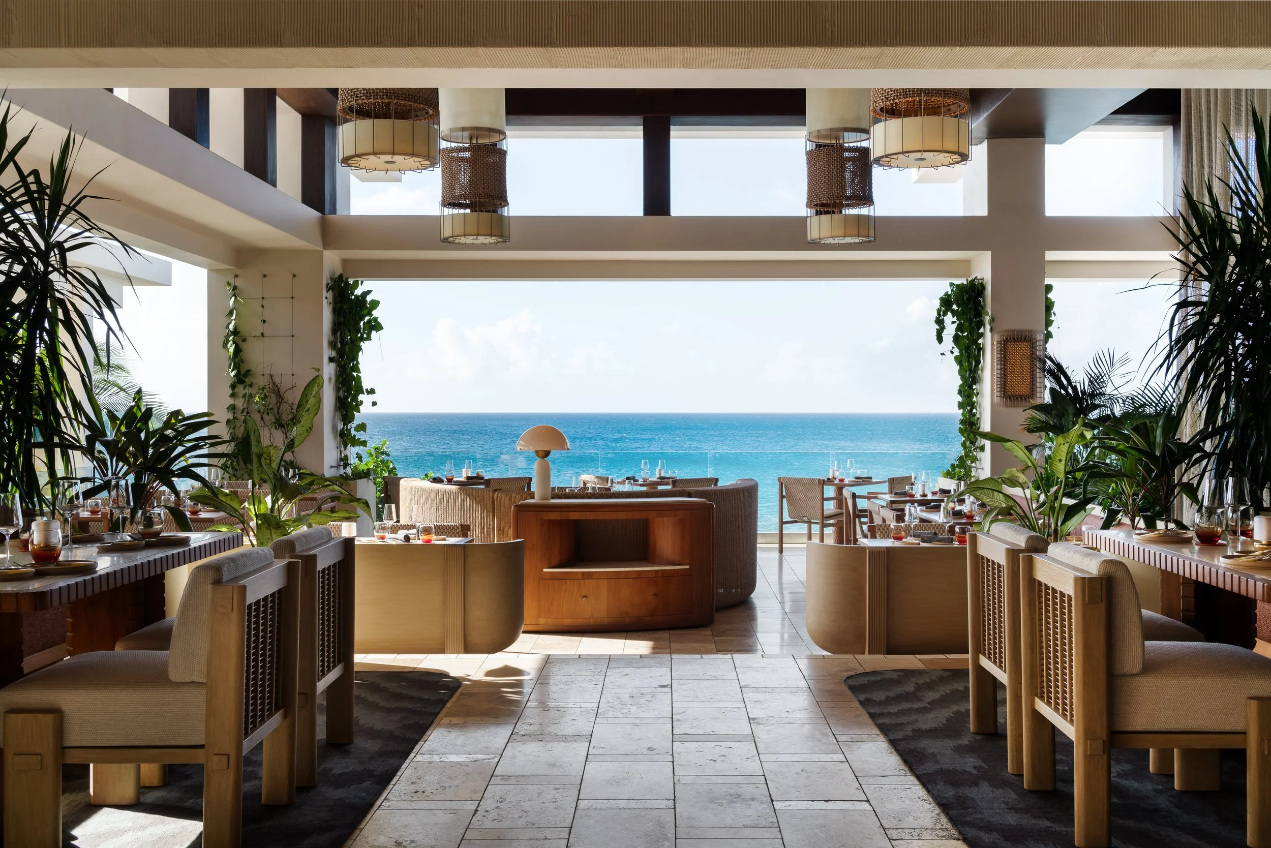 Layered plantings, flowing drapery, and curated artwork create intimate zones within the open-air plan, softening the architecture and framing views of sea and sky. A material palette inspired by the island’s rust and cream-toned limestone contrasts vividly with the surrounding turquoise water, grounding the space in its landscape. Custom furnishings and sculptural light fixtures draw from Anguilla’s weaving traditions and carved wood craftsmanship, infusing the restaurant with authenticity and tactile richness.