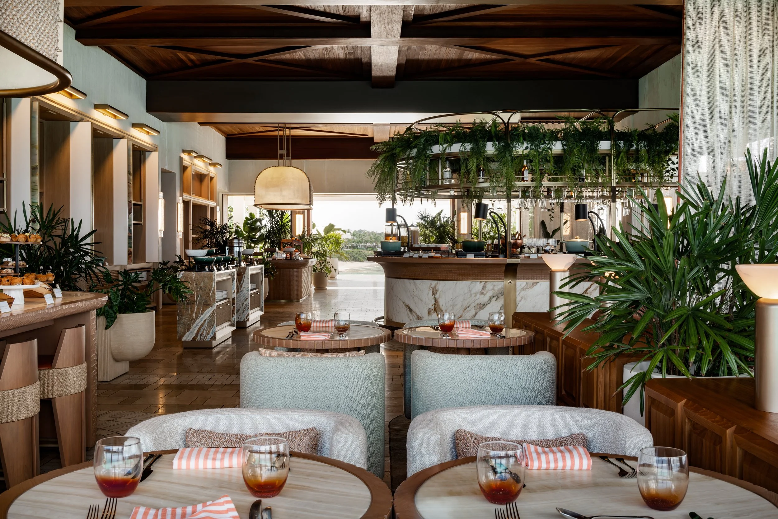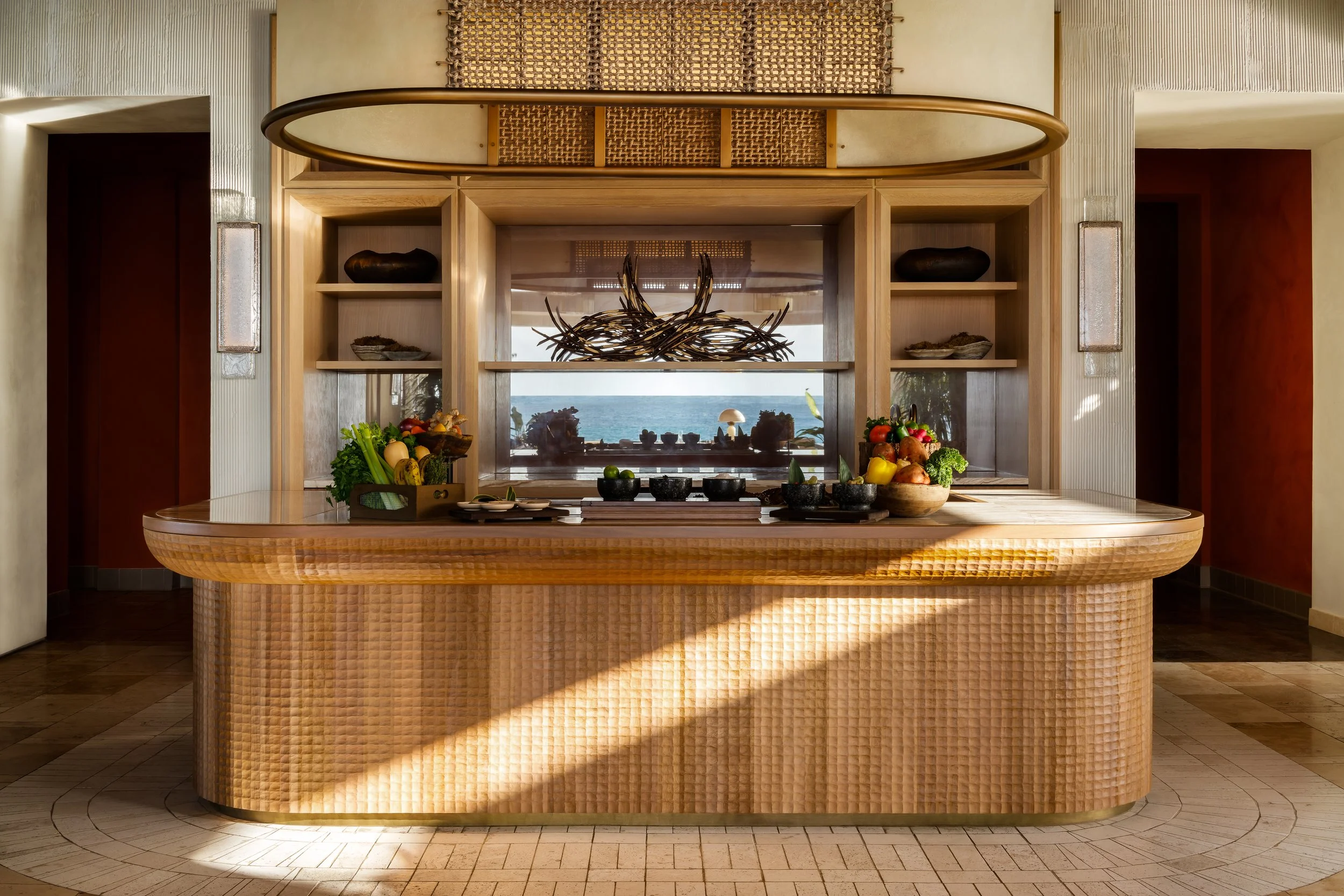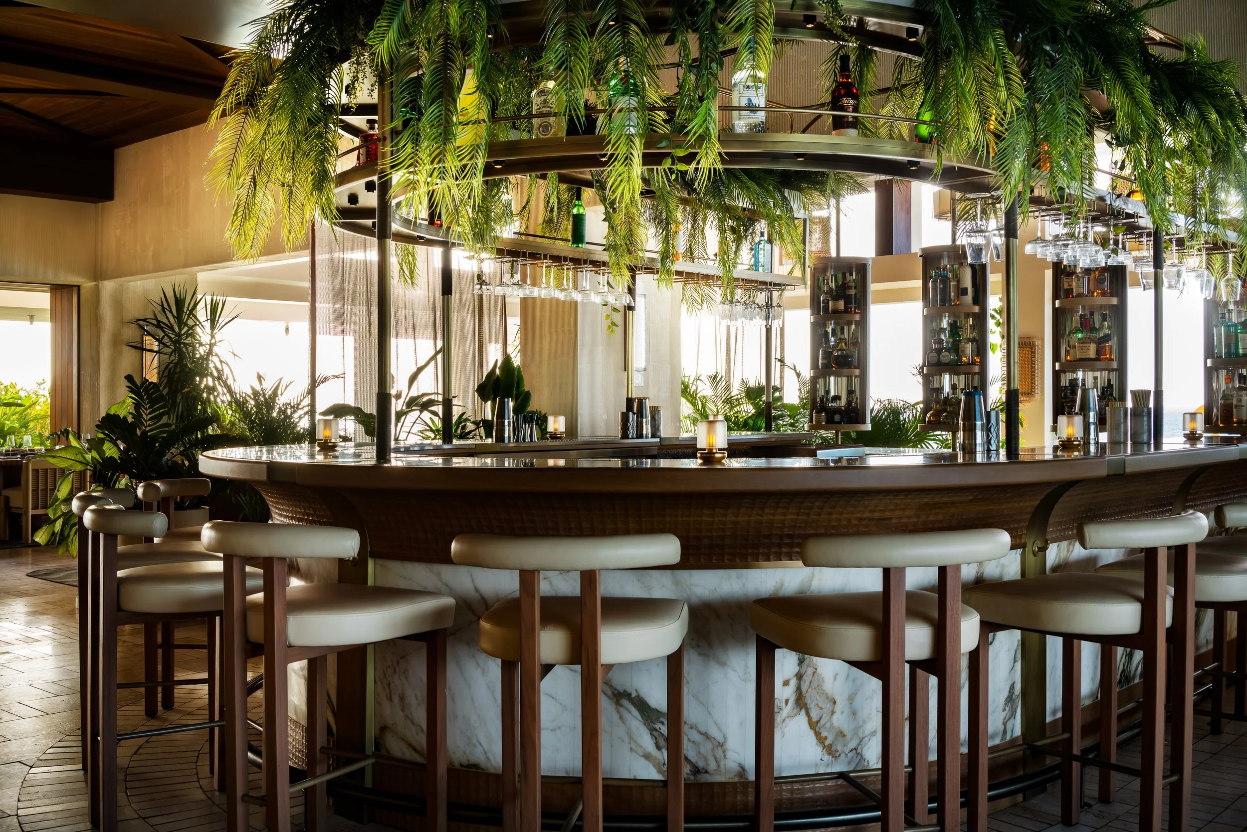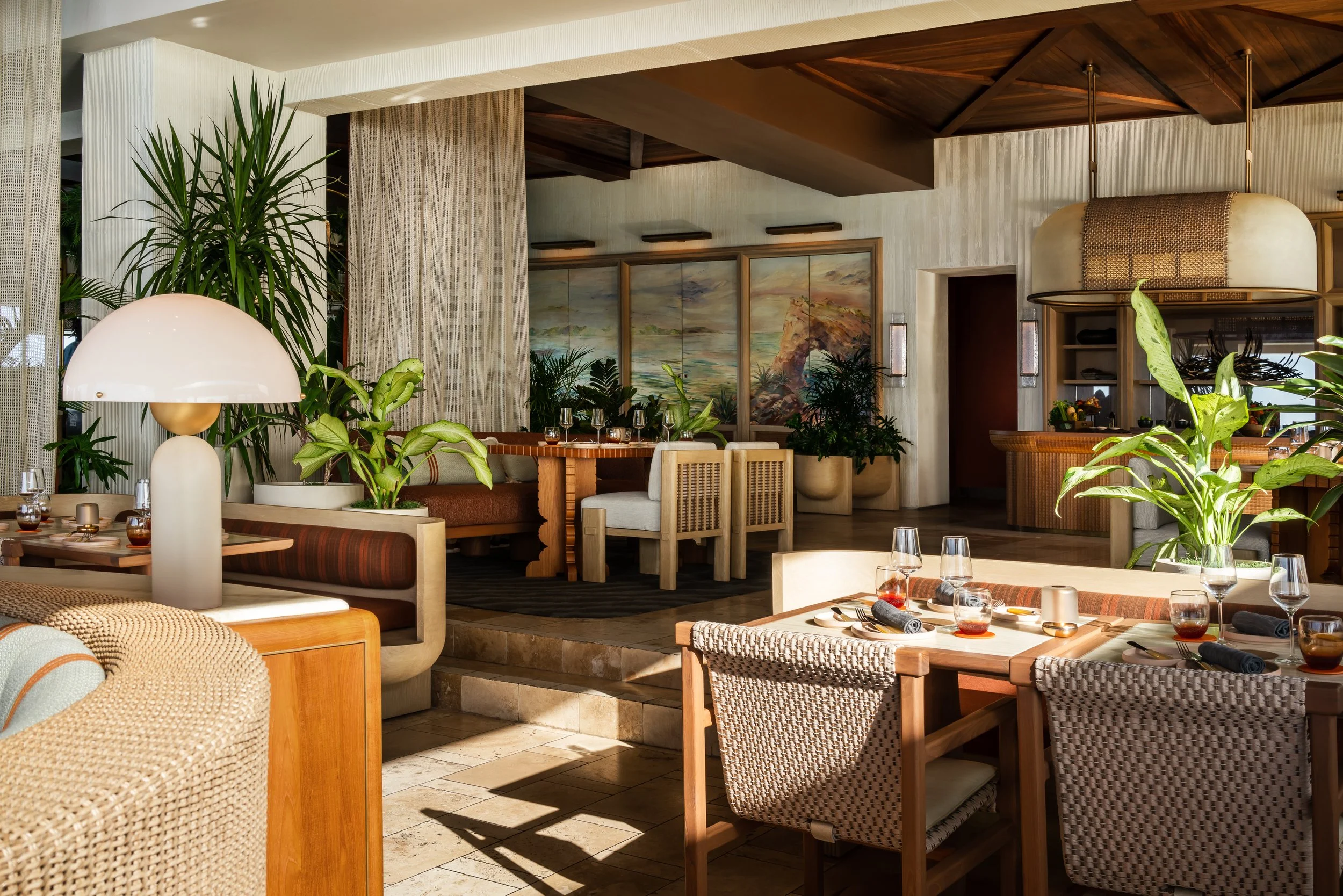 Layered plantings, flowing drapery, and curated artwork create intimate zones within the open-air plan, softening the architecture and framing views of sea and sky. A material palette inspired by the island’s rust and cream-toned limestone contrasts vividly with the surrounding turquoise water, grounding the space in its landscape. Custom furnishings and sculptural light fixtures draw from Anguilla’s weaving traditions and carved wood craftsmanship, infusing the restaurant with authenticity and tactile richness.