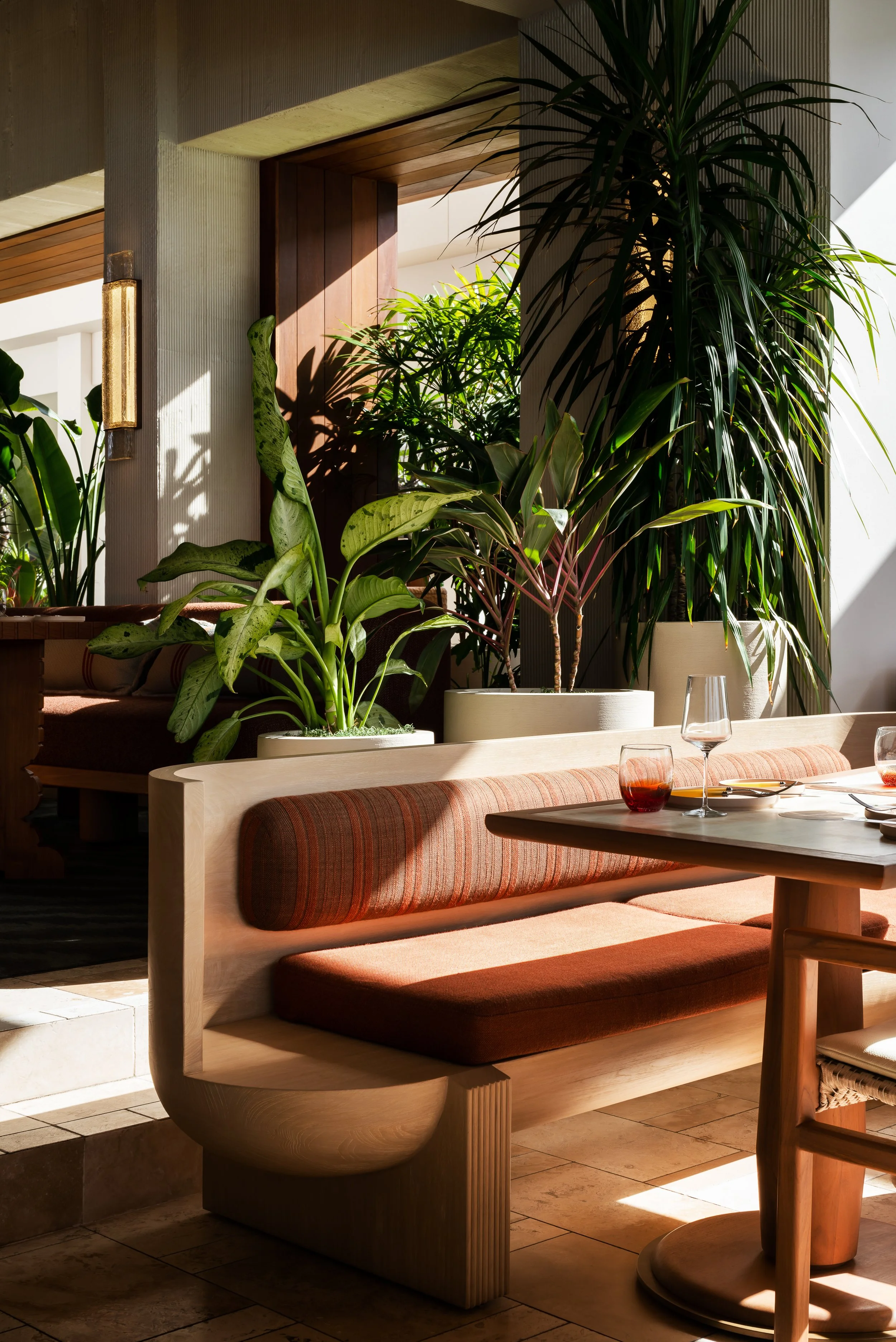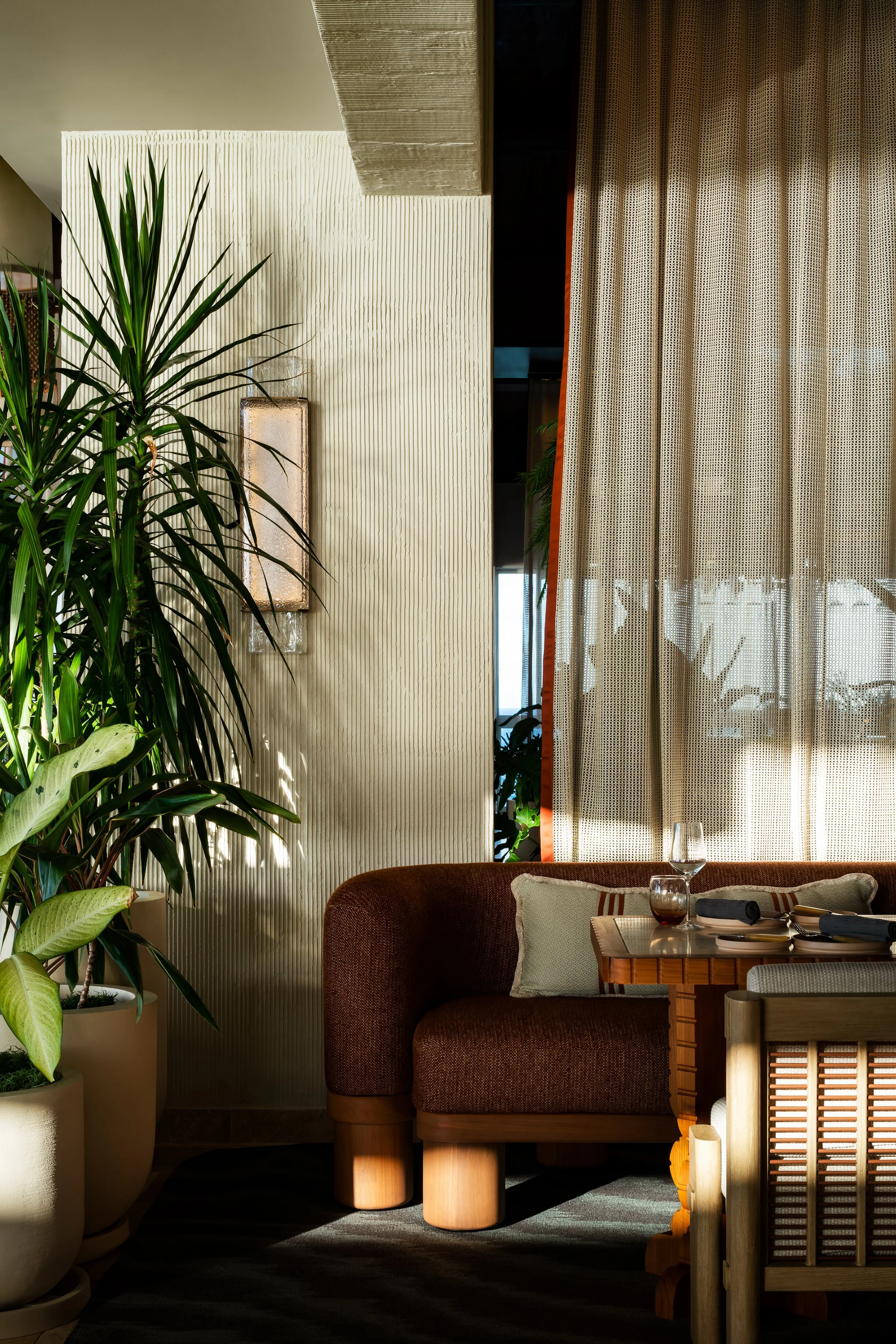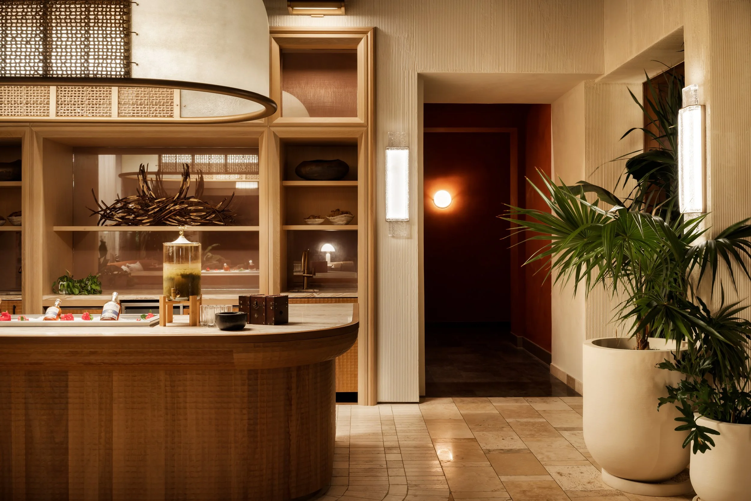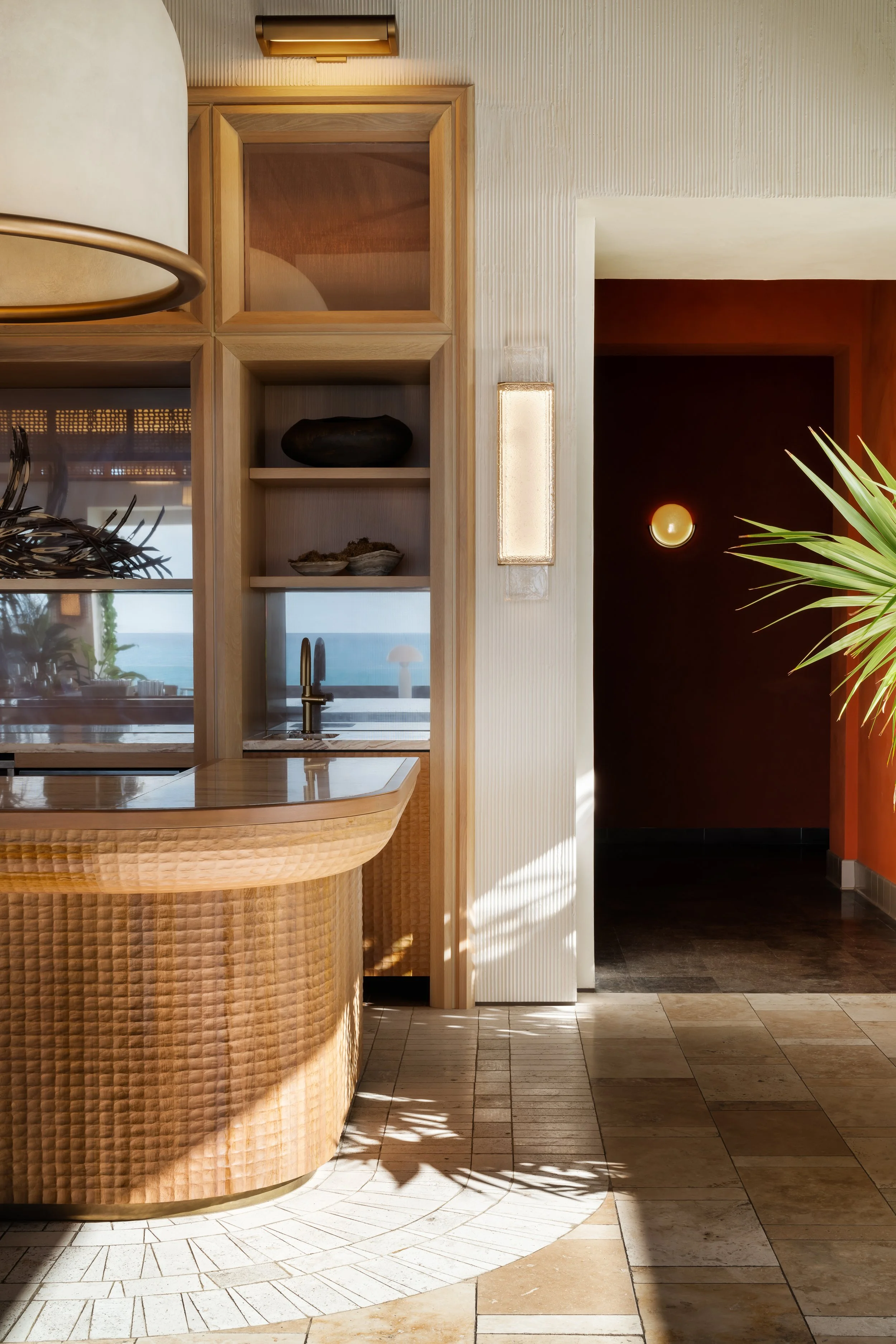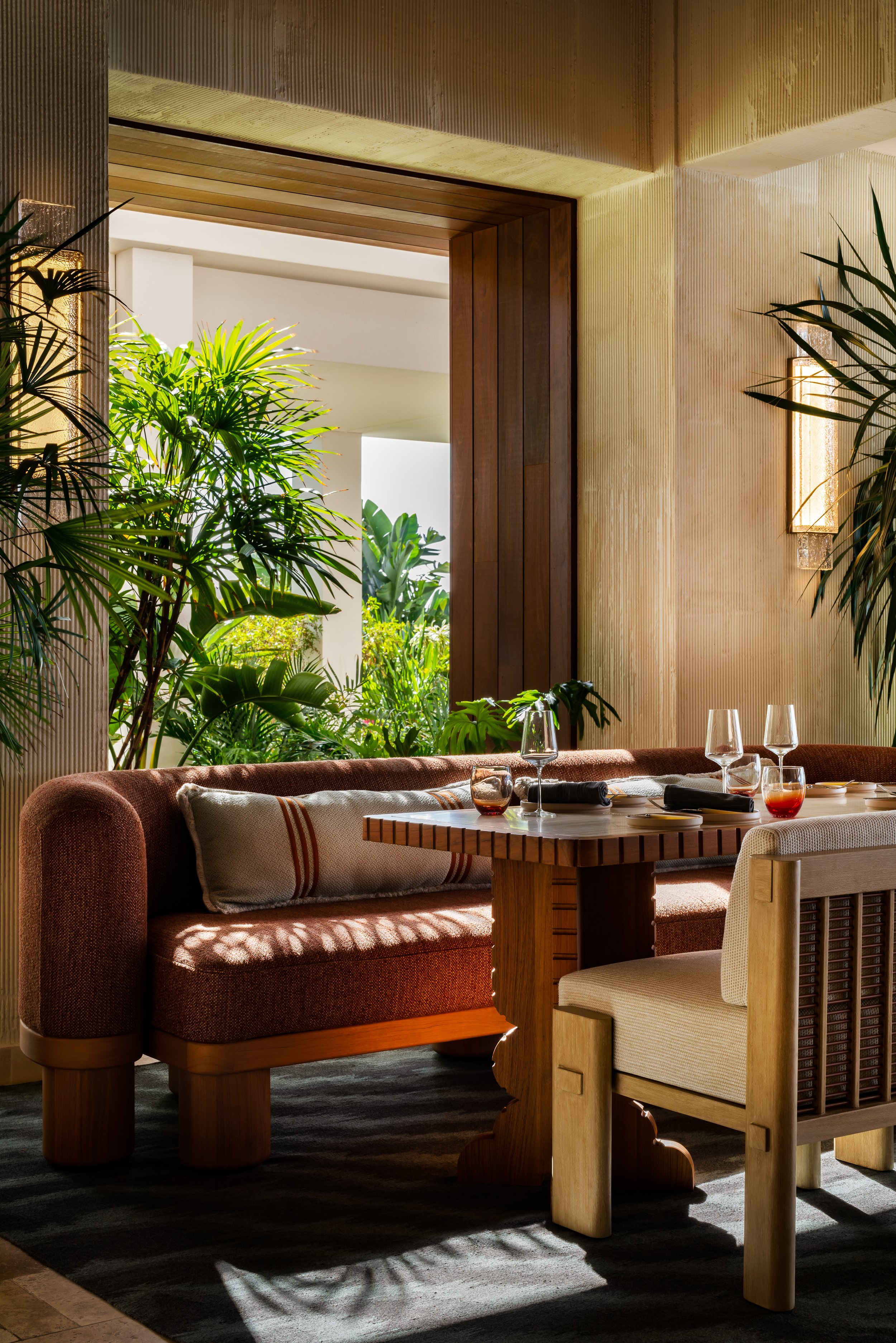Layered plantings, flowing drapery, and curated artwork create intimate zones within the open-air plan, softening the architecture and framing views of sea and sky. A material palette inspired by the island’s rust and cream-toned limestone contrasts vividly with the surrounding turquoise water, grounding the space in its landscape. Custom furnishings and sculptural light fixtures draw from Anguilla’s weaving traditions and carved wood craftsmanship, infusing the restaurant with authenticity and tactile richness.